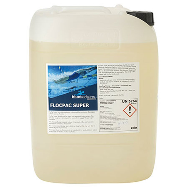 Blue Horizons FlocPac Super Liquid is a highly effective liquid flocculant requiring low dosing rates, designed for continuous flocculation with approved dosing equipment to keep water clear of small particles.