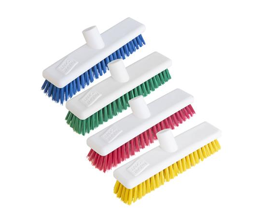 A cost effective 12 inch hard bristle broom head for use outdoors or on scrubbable floors, suitable for washing after use. Colour coded for hygiene and contamination control. Handles sold separately