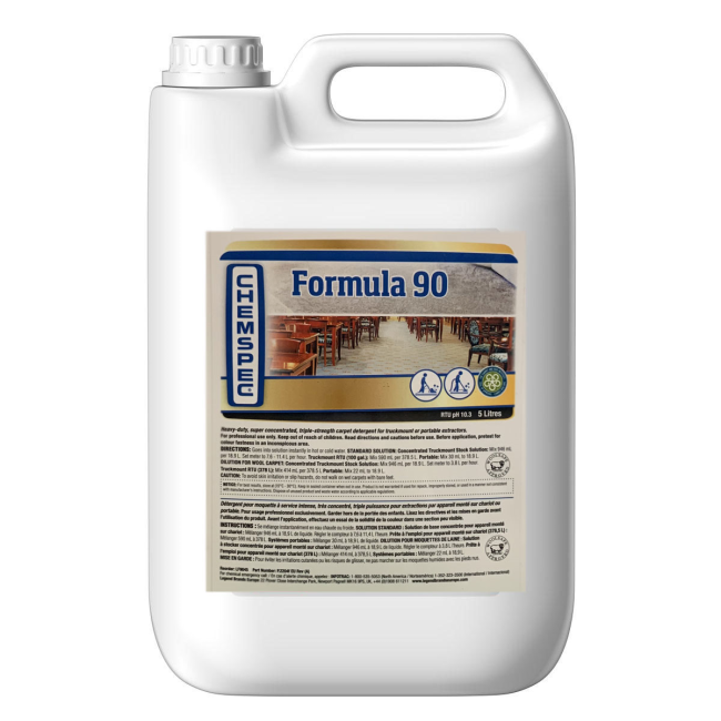 Formula 90 Liquid triple-strength carpet detergent features multiple dilution options for flexible application Featuring one of the highest dilution ratios in the market, Formula 90 liquid is the most economical cost per use available.