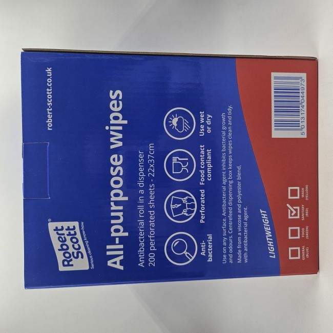 This antibacterial roll in a portable dispenser contains 200 lightweight, perforated wipes. Designed for single use on any surface to prevent cross-contamination as part of your hygiene colour coding system. The antibacterial agent inhibits bacterial growth and odours. All-purpose wipes are food contact safe, made from a viscose and polyester blend.