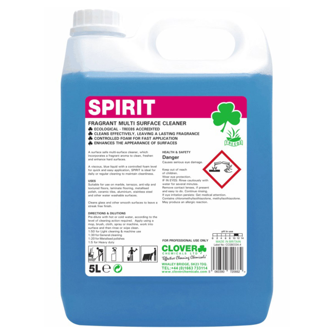 Clover 350 Spirit Fragrant Multi-Surface Cleaner is a surface safe multi-surface cleaner, which incorporates a fragrant aroma to clean, freshen and enhance hard surfaces. A viscous, blue liquid with a controlled foam level for quick and easy application, Spirit is ideal for daily or regular cleaning to maintain cleanliness. Suitable for use on rubber, marble, terrazzo, anti-slip and textured floors, laminate flooring, metallised polish, ceramic tiles, aluminium, stainless steel and other water washable surfaces. Ideal for use in schools, colleges, hotels, offices, airports, factories, shops, shopping centres, ferries, bars, nightclubs and pubs.