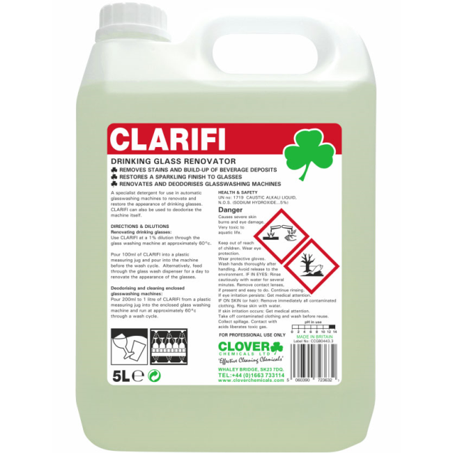 Clover 369 Clarifi Drinking Glass Renovator is a special glass renovator for use in automatic glasswashing machines, to remove staining and the build up of soil from drinking glasses. Clarifi can also be used to deodorise the machine itself.