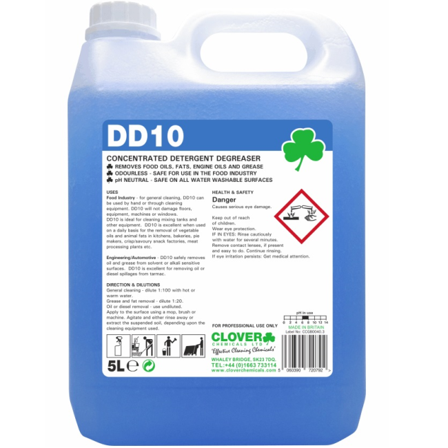 Clover 404 DD10 Concentrated Detergent Degreaser is a concentrated, water based detergent emulsifier. Removes liquid oils and grease from impervious surfaces. An exceptional detergent degreaser, DD10 contains a blend of emulsifiers to remove food oils a